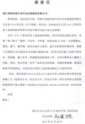 2014年湛江合众公司涠洲项目感谢